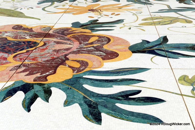 The tile covering the courtyard is of a floral design: