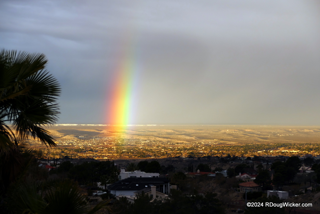 I‘m going to interrupt my Middle East photo tour for something a bit different this week. Next week I’ll resume our visit earlier this year to two destinations within the United Arab Emirates. So, if you’re looking forward to some views of Dubai and a video starring the world’s tallest building, do not despair. As for this week, the theme is Dramatic Skies, Automobiles, Desert Flowers, and a Mystery Destination. See if you can figure out that destination from the photographs and clues today, Wednesday, and Friday, and leave a comment if you have a guess. On Saturday I will reveal the answer. In the meantime, let’s start with a desert rainbow as seen from my backyard: