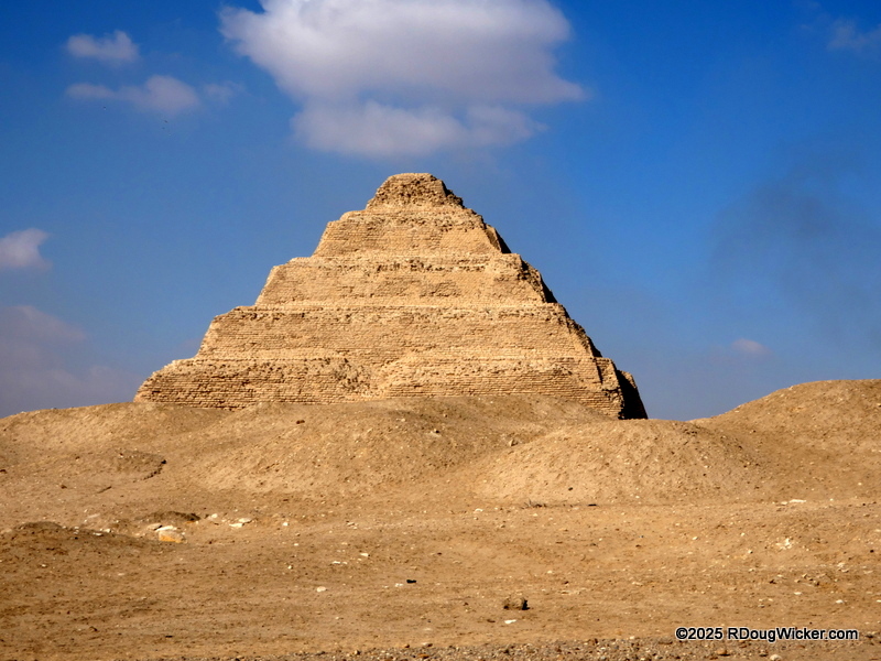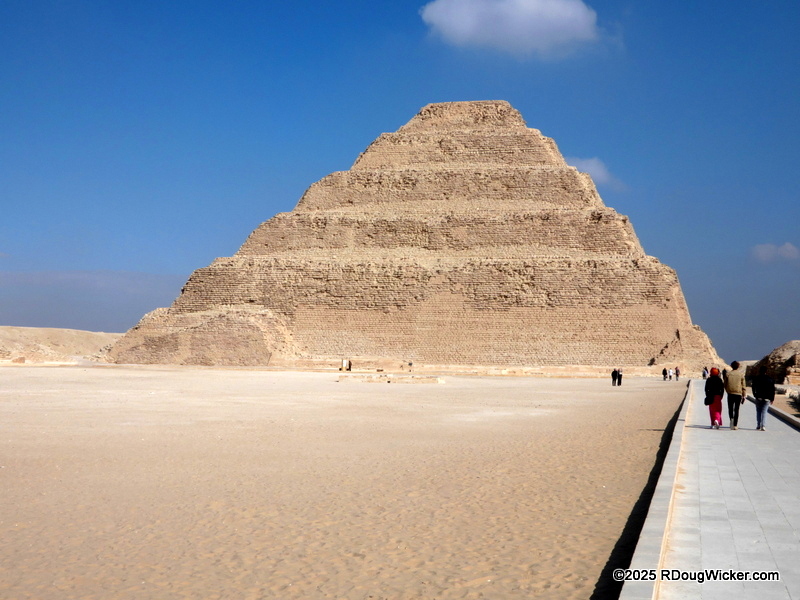 After Ursula and I departed Bucharest, Romania, we headed off to a destination we hadn’t visited since 1984 — Cairo, Egypt. This would be our first stop in Egypt for continuing south to Aswan for a Nile River cruise. And upon our arrival at the Mar Chabel Hotel, while we waited for the front desk staff to find our reservations (and waited… and waited…), Ursula booked us on a tour for the next day. This tour would take us first to Saqqara, an ancient necropolis featuring the oldest known Egyptian pyramid. That would be the Pyramid of Djoser, also known as the Step Pyramid, and it dates back to the 27th century BC.