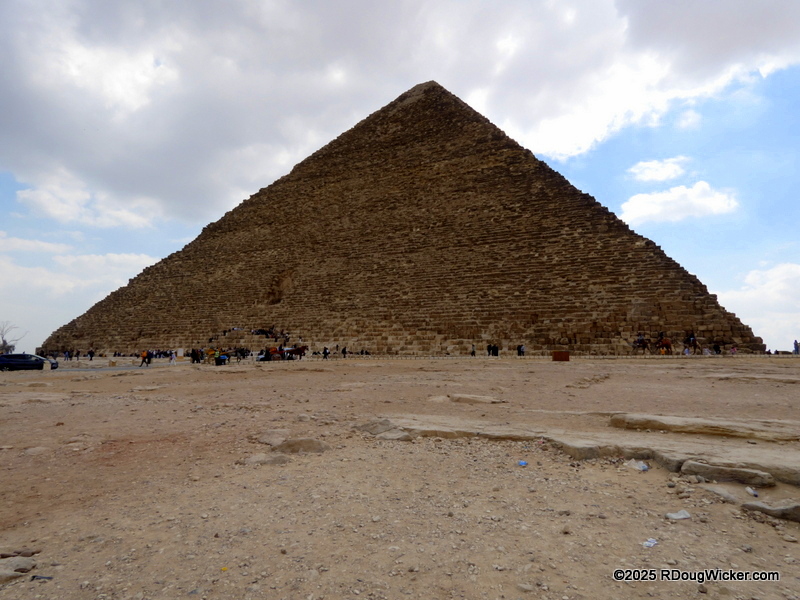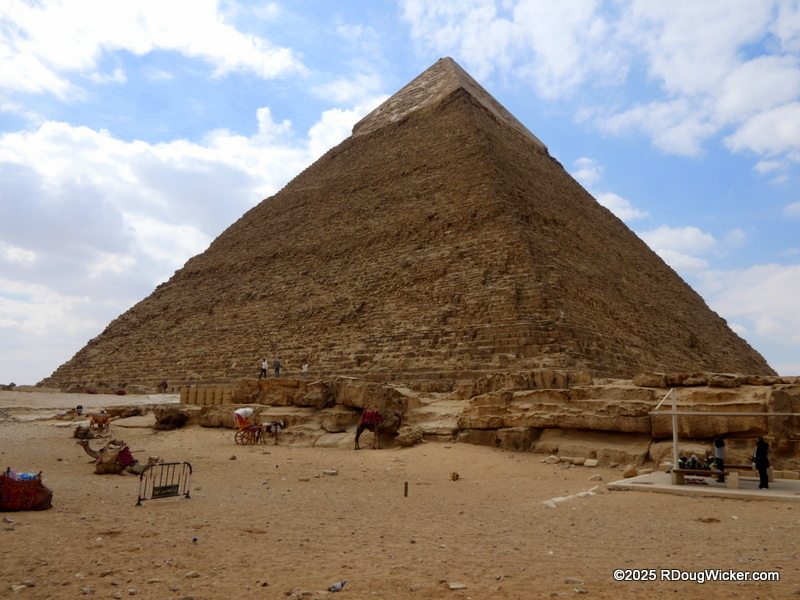 After our visit to Saqqara and stops at various shops I told you about last week, our next tour stop was the Giza Pyramid Complex. Here you’ll find three very large pyramids, the Great Sphinx of Giza, and an assortment of smaller pyramids, all of which were built during the 4th Dynasty of the Old Kingdom. Of the three larger pyramids, the Great Pyramid (also known as the Pyramid of Cheops or Khufu) is the most famous because it is the largest — currently 454 feet/138.5 meters high, which is some 27 feet/18 meters shorter than its original height. Seen in the Wikipedia diagram below, it is the large pyramid in the upper right quadrant: