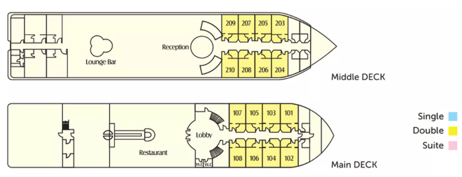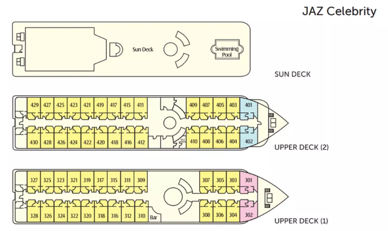 The Jaz Celebrity has five decks open to passengers: Main Deck, Middle Deck, Upper Deck 1, Upper Deck 2, and the Sun Deck.