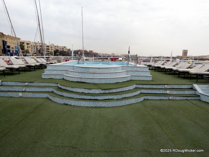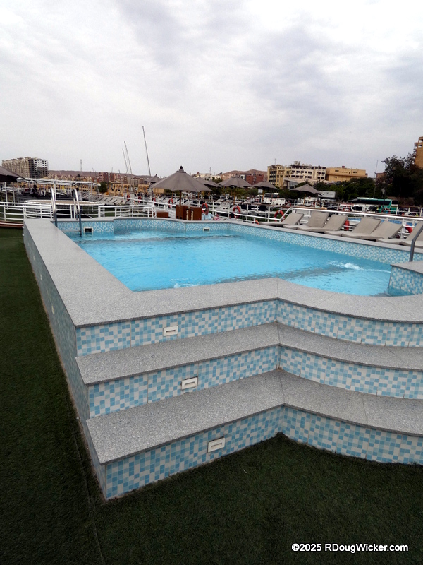 Before heading down to the cabin, let’s look around the top deck of Jaz Cruises’ River Nile boat Jaz Celebrity. Up here you’ll find sun lounges, a bar with lunch snacks (mostly sandwiches and some sweets), and a pool. That’s on top of the great River Nile views, so you’ll probably be spending a lot of time up here. And don’t worry about getting too much sun. There are tables and chairs beneath shades toward the aft end of the boat.