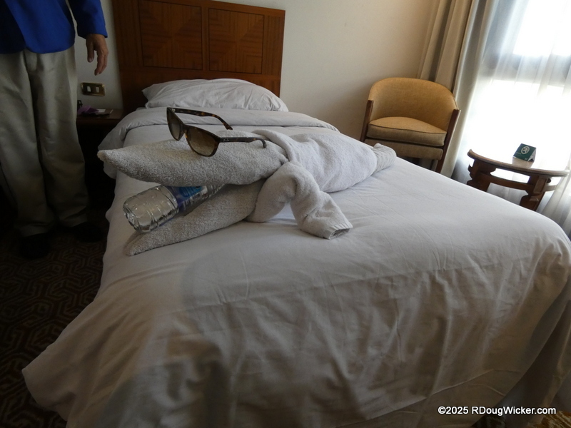 Anwar is also quite handy at towel are. One day we came in to find a Nile crocodile waiting for us atop the bed, complete with a water bottle and Ursula’s sunglasses: