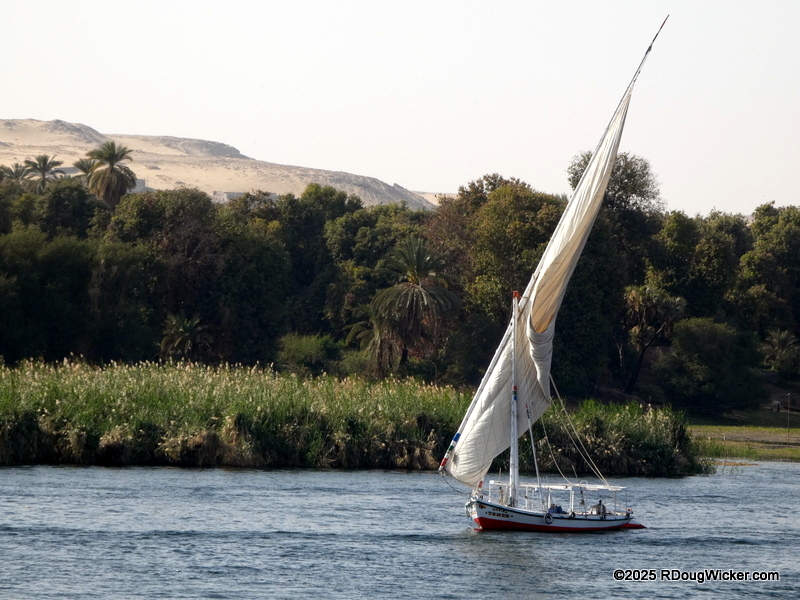 After overnighting in Aswan and visiting Abu Simbel, we made it back to Jaz Cruises‘ riverboat Jaz Celebrity to begin our Nile cruise to Luxor on 27 February in the afternoon. The pictures you’ll see today and Wednesday weren’t all taken on that day, but were spread out over the course of the cruise. I did this to give you the flavor of this segment of the River Nile, so I hope you won’t mind the jumping around. And much of that flavor comes from the traditional Nile sailboat, the felucca. The most distinctive and recognizable feature of the feluca would, of course, be the triangular lateen sail. You’ll find some Nile feluccas may have two of them, but most often you’ll see feluccas sporting only a single lateen: