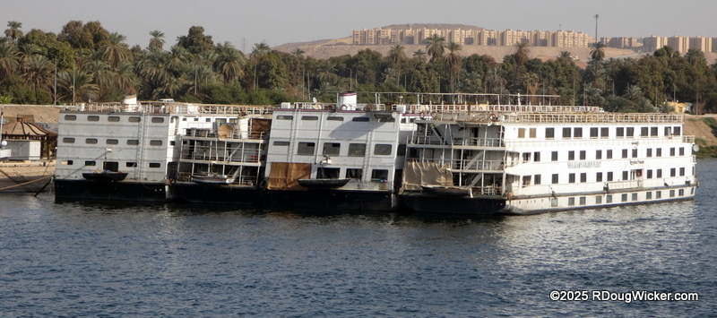 By the way, if you’ve never traveled by riverboat, you may be wondering how these things dock along the banks considering the limited number of mooring points available. And how do you get load passengers onto three or four boats when there’s only one moor? Well, you do it by boarding the boat alongside the shore, then passing through it and each subsequent boat until you arrive at your temporary home. Look at this next image. If you’re traveling on the boat on the right, you enter the boat on the far left and traverse through the two boats in the middle to gain access: