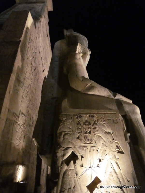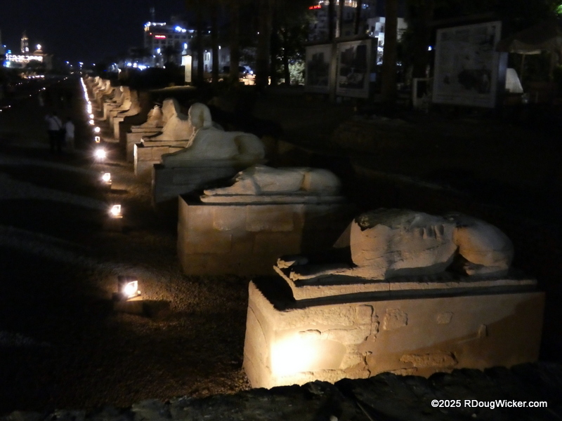 As you may recall, it’s already been a very busy day for us. We began with an early morning jaunt to the Temple of Edfu, a transit through the Esna Lock which took around four hours beginning with a lengthy delay south of the Esna Dam while we awaited our turn through the lock. Now it’s after sunset, we’ve already dined with Mohamad aboard our riverboat the Jaz Celebrity, and Mohamad has delivered us to the Luxor Temple. To our south is the massive Luxor entrance pylon (top image), and to the north lies the 1.24-mile/2km long Avenue of Sphinxes along which over 600 sphinxes line both sides: