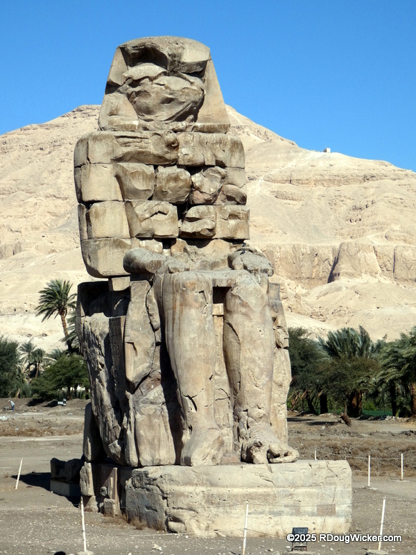 But you know what is missing from that list? Sailplane, blimp, semi-rigid airship (like a blimp but with an internal truss supporting the envelope), and a hot air balloon. Lacking a flight on tht last one was something we intended to remedy this trip, so before sunrise on Saturday, 1 March 2025, Ursula and bundled up and headed out to the launch site along with around a dozen fellow balloon “gondoliers”. But as soon as we arrived I expressed my doubts. No; I wasn’t having second thoughts about the flight. I was judging the wind and told our gondola companions that my money was we would be cancelled out. After waiting over an hour, that’s precisely what happened, doggonit. So, back to our riverboat to join up with Mohamad Salah for some different adventures. First stop: The 14th century BC Colossi of Memnon.