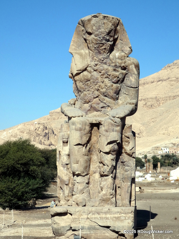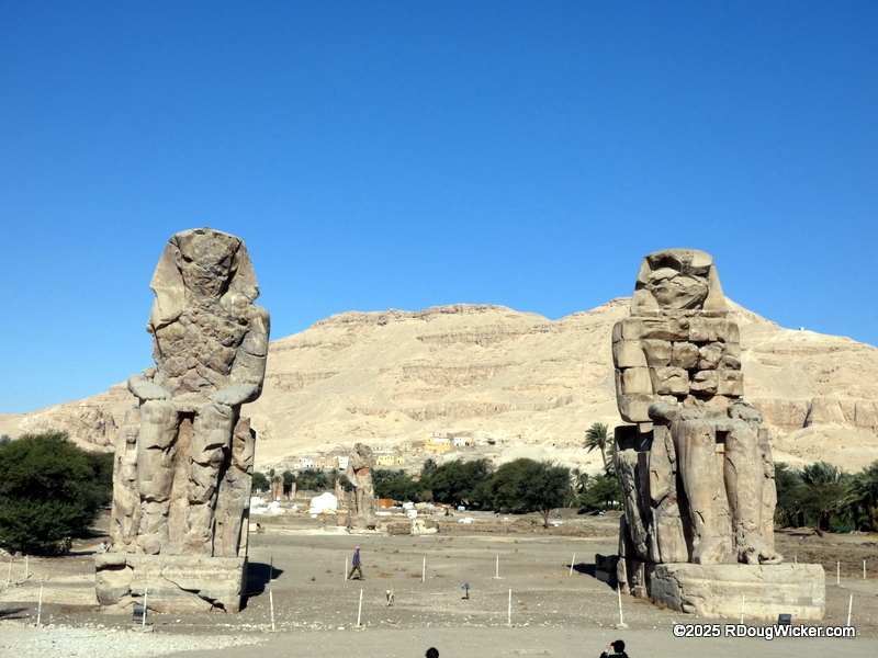 But you know what is missing from that list? Sailplane, blimp, semi-rigid airship (like a blimp but with an internal truss supporting the envelope), and a hot air balloon. Lacking a flight on tht last one was something we intended to remedy this trip, so before sunrise on Saturday, 1 March 2025, Ursula and bundled up and headed out to the launch site along with around a dozen fellow balloon “gondoliers”. But as soon as we arrived I expressed my doubts. No; I wasn’t having second thoughts about the flight. I was judging the wind and told our gondola companions that my money was we would be cancelled out. After waiting over an hour, that’s precisely what happened, doggonit. So, back to our riverboat to join up with Mohamad Salah for some different adventures. First stop: The 14th century BC Colossi of Memnon.