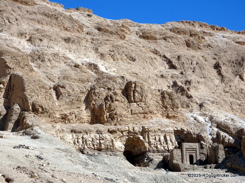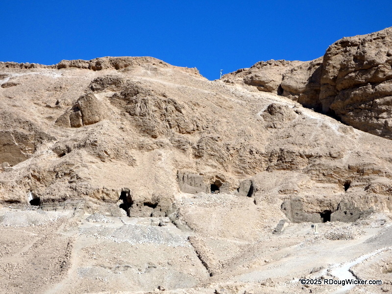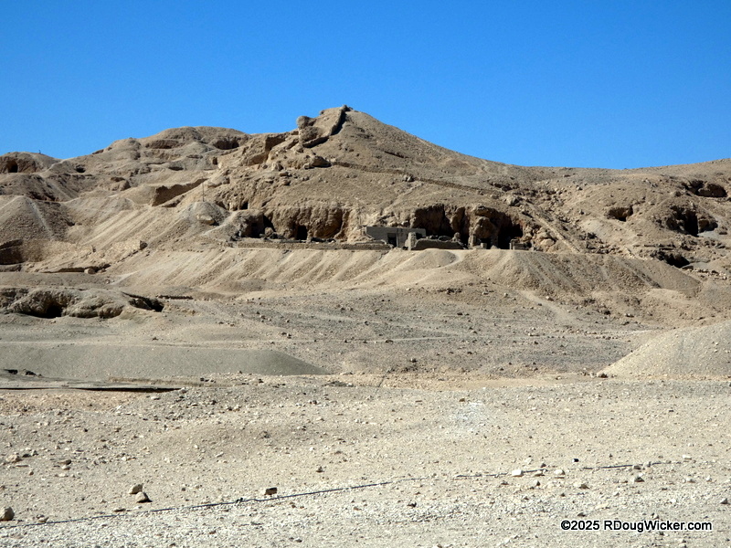 I know what you’re probably thinking right about now: 1) That’s impressive! 2) Hatshepsut must’ve been a really important king to warrant this mortuary temple! Well, it is indeed impressive. The mortuary’s design is very unique among others we’ve seen, and the detail is extraordinary. This is some truly classic Ancient Egyptian architecture! Where you would go wrong, however, is on that second thought. This pharoah wasn’t a king. Hatshepsut, the sixth ruler of Ancient Egypt’s Eighteenth Dynasty, was the second confirmed queen regnant (female “king”) to rule Egypt, the first being Sobekneferu from Ancient Egypt’s Twelth Dynasty some 350 years earlier. We’ll head on over the mortuary momentarily, but first I want to show you what you’ll see in the surrounding hillsides. There are many other temples and mortuaries around here in what is but a small part of the entire Theban Necropolis:
