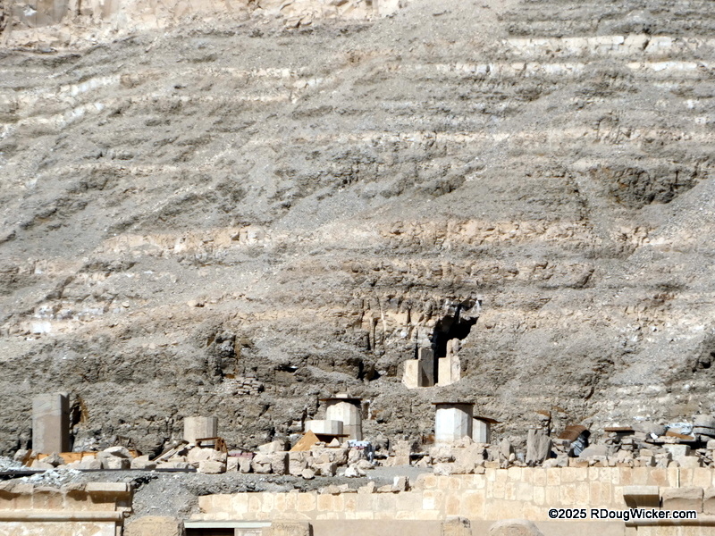 In the photograph I borrowed from Wikipedia, the second from the top in today’s article, you’ll notice what appears to be a second platform with rubble above it. You also might wonder, in a land known for earthquakes, just how stable is that sheer cliff above Hatshepsut? You would do well to wonder, for that rubble belongs to two other Deir el-Bahari temples — Thutmose III and Mentuhotep II — and they were destroyed by an earthquake and resulting cliff collapse during the beginning of the Twenty-First Dynasty. Not a whole lot remains of either structure: