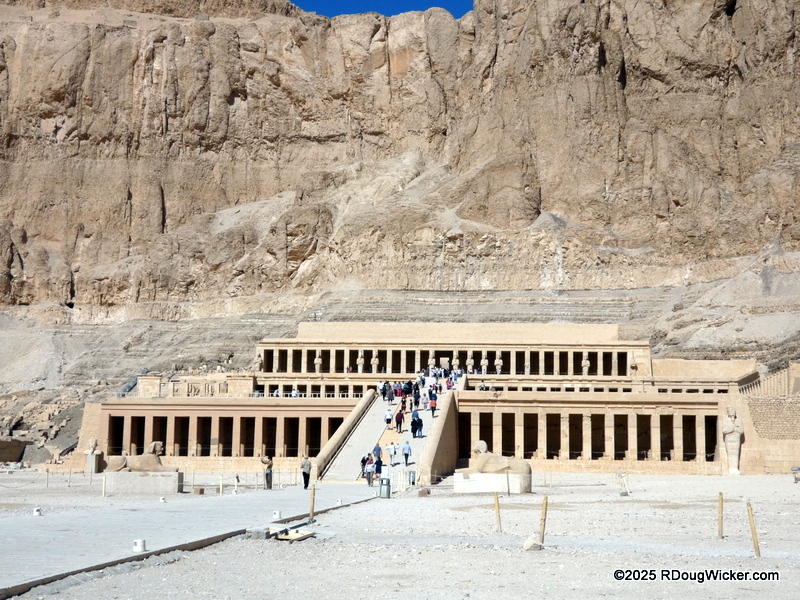 Our driver dropped the three of us off at the parking lot for our next stop this fine, 1 March 2025 day, and Mohamad led us through the ever-present souvenir vendor gauntlet toward our next Ancient Egypt archeological site — the Mortuary Temple of Hatshepsut. The image below is courtesy of Wikipedia. I borrowed it for this article to give you a sense of this temple’s immense size from an aerial perspective: