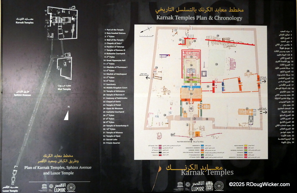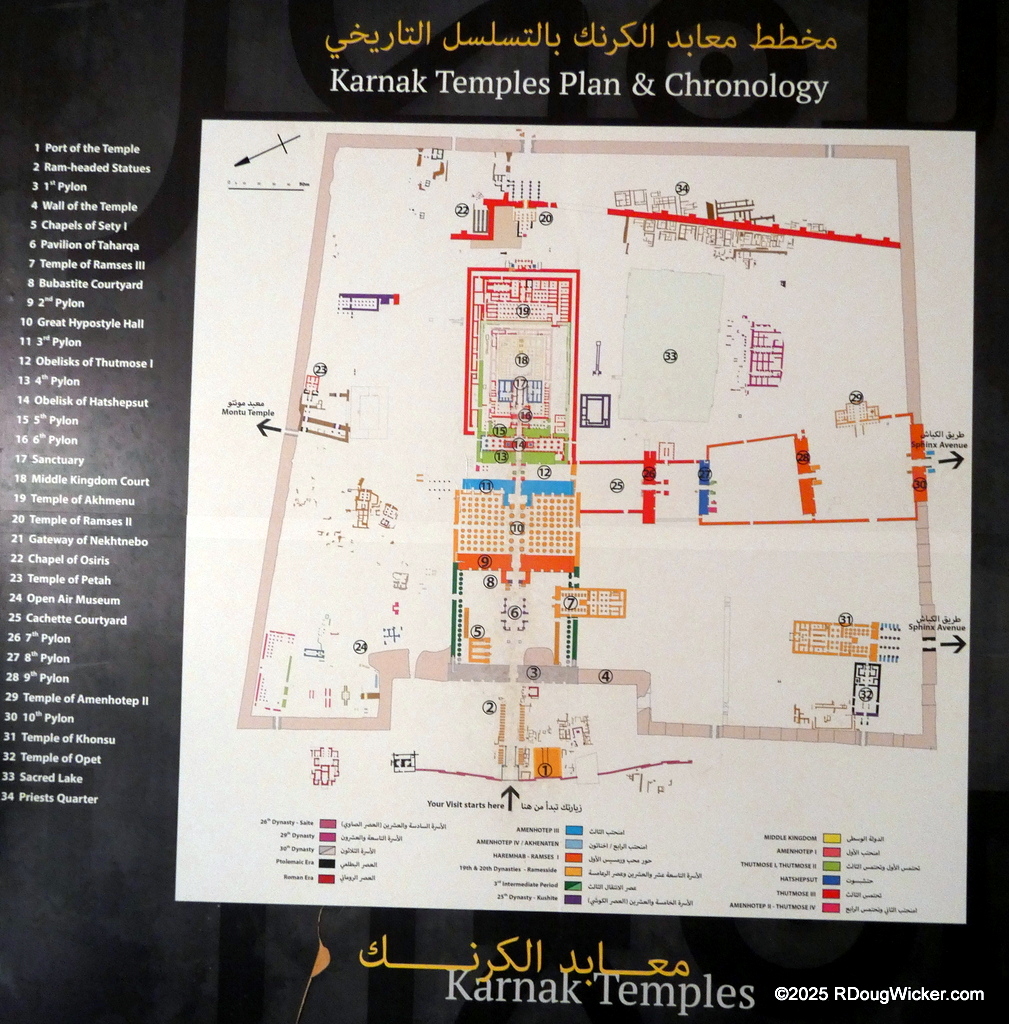 Of course, the important thing here is the actual annotated complex diagram, so let’s zoom in on that. The arrow at the bottom is the entrance into the complex. The aforementioned Great Hypostyle Hall is the orange colored area labeled #10.