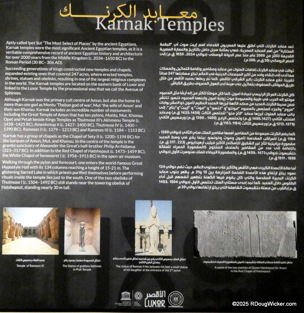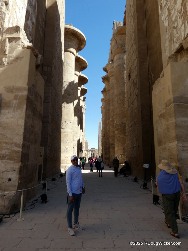 Our last stop on this River Nile cruise aboard the Jazz Celebrity, and indeed our last stop in Egypt before flying out to Istanbul the next day, was the Karnak Temple Complex. This last stop would be particularly bittersweet, as it also meant the end of our wonderful time with our exceptional tour guide throughout this journey, Mohamad Salah. If you can one day make this trip, I cannot recommend highly enough Luxor and Aswan Travel and Mohamad Salah. And since the tour included all entry fees, chauferred transportion, and other amenities, it’s not as expensive as one might think. For the two of us it ran about $1,900, of which $250 was reimbursed because our hot air balloon ride was cancelled.