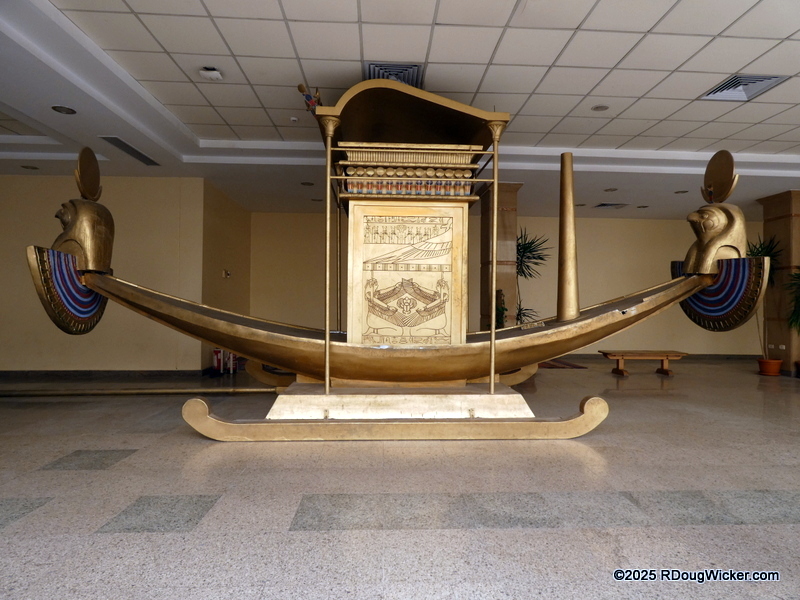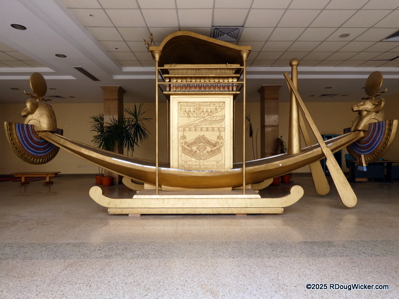 Before you get to that arrow and the Great Hypostyle Hall, however, you still must get through the exhibition hall. In that hall are, among other things, replicas of Ancient Egyptian solar barques used in rituals and funerary practices. This particular solar barque depicts the ram-headed god Amun: