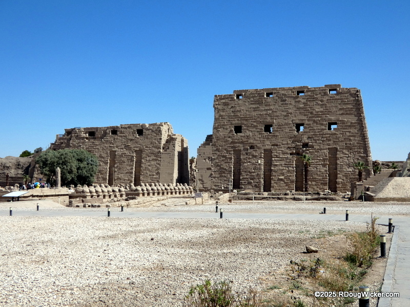 As you can see in the above image, you’ll pass through the Avenue of Rams lining the approach to the pylon entry. The Avenue of Rams is not far away from the Avenue of Sphinxes that I showed you in my previous Luxor Temple article. Indeed, the Avenue of Rams is considered an extension of the Avenue of Sphinxes. This 1.67-mile/2.7km dromos is lined with 1,057 statues, of which 807 are sphinxes leading into Luxor and 250 are criosphinxes (ram heads on lion bodies) on the approach to Karnak.