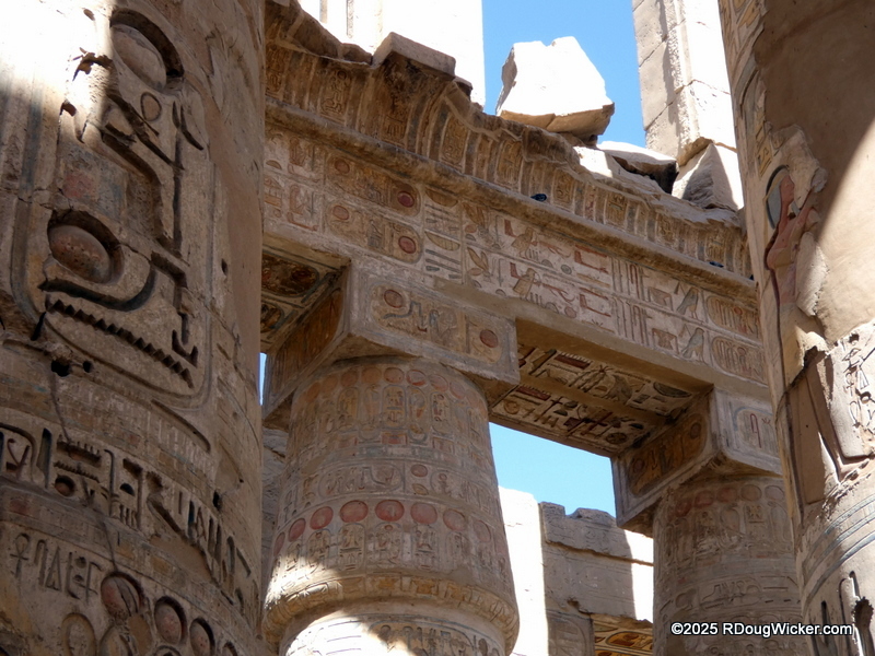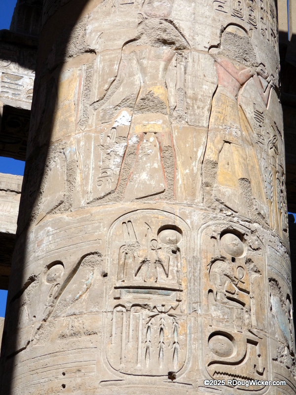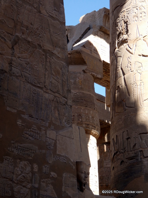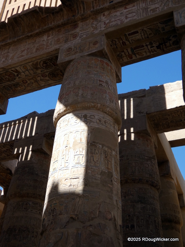One of the things I most enjoyed about photographing Karnak was the way light and shadow played across the numerous columns, highlighting hieroglyphics and bas reliefs. Indeed, I anticipate that many of these photographs will convert very nicely into black & white, especially with some judicial use of color filtering before the conversion. And in case you’re wondering what I mean by that, here are some articles I wrote on the subject: Black & White Photography—It’s All in the Color!, Black & White Filtering After the Picture is Taken (and with FREE Software!) (alas, that “free software” is no longer supported by Google, but I’m sure you can find a substitute), and Color Filtering in Black & White Revisited. But enough with the photo tips for today. Let’s get back to Karnak.