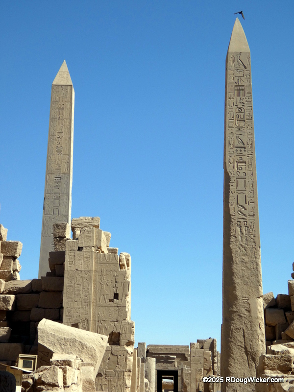 I recently mentioned that among all the other sights here, there are also some obelisks, but so far I’ve not shown you any. Today I correct that. Remember our visit to the Mortuary Temple of Hatshepsut? Well, that’s not the only construction project for which she was responsible. Two of the obelisks here at Karnak were constructed for her. And being that Hatshepsut was one of the few female pharaohs, it’s perhaps fitting that she selected pink granite. The second of her two obelisks has since toppled, so the smaller obelisk you see below belonged to Thutmose I. Hatshepsut’s obelisk stands 97 feet/29.5 meters tall and weighs about 323 tons. The obelisk for Thutmose I is 71 feet/21.7 meters tall and comes in at around 143 tons.