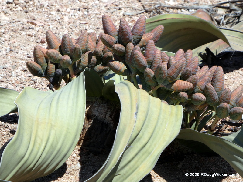 Both male and female welwitschia develop reproductive cones that produce insect-enticing nectar to facilitate pollination.