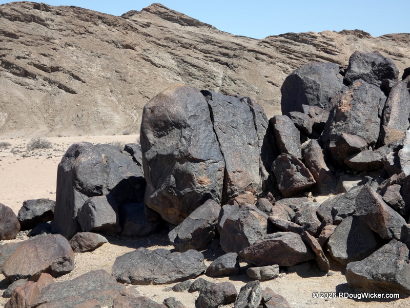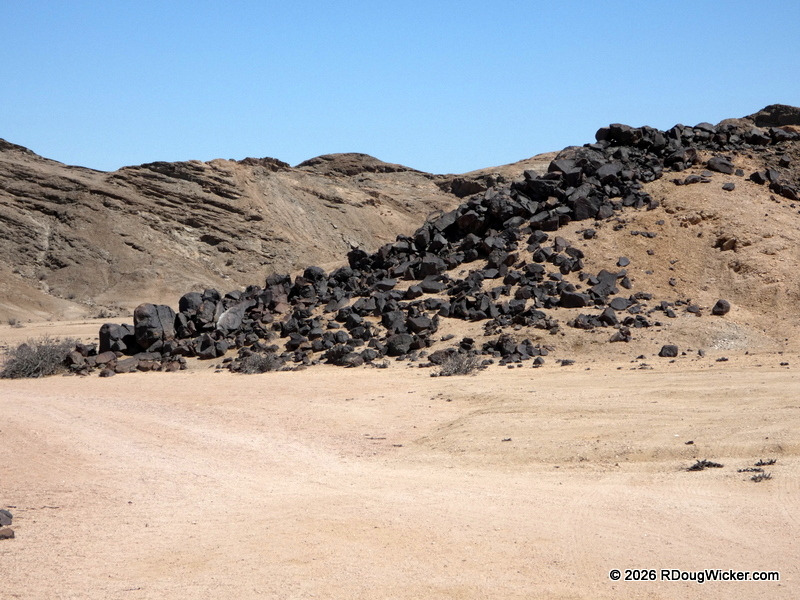 Around noon on 14 March 2025 we continued our tour of Namib-Naukluft National Park. Refreshements and a bathroom break were about thirty minutes away, and the German town of Swakopmund awaited us beyond that. One of the sights I want to show you today is the fields of volcanic diabase (a.k.a., dolemite) that punctuate the Namib Desert.