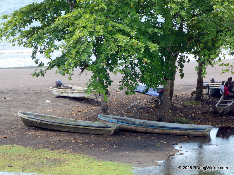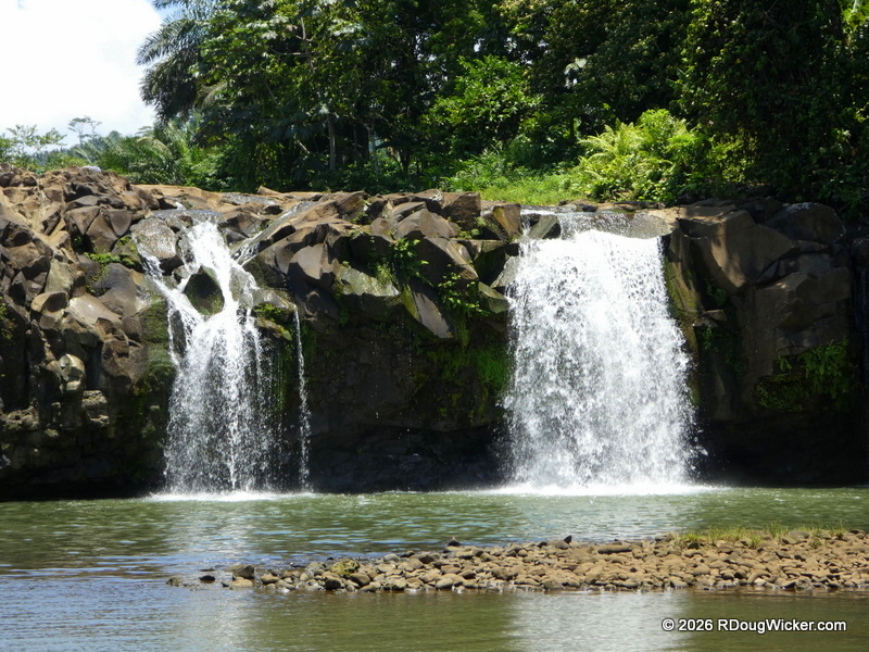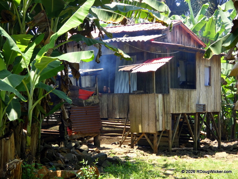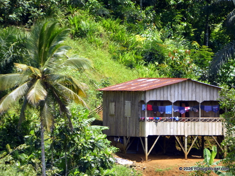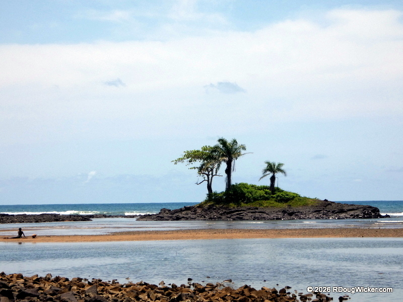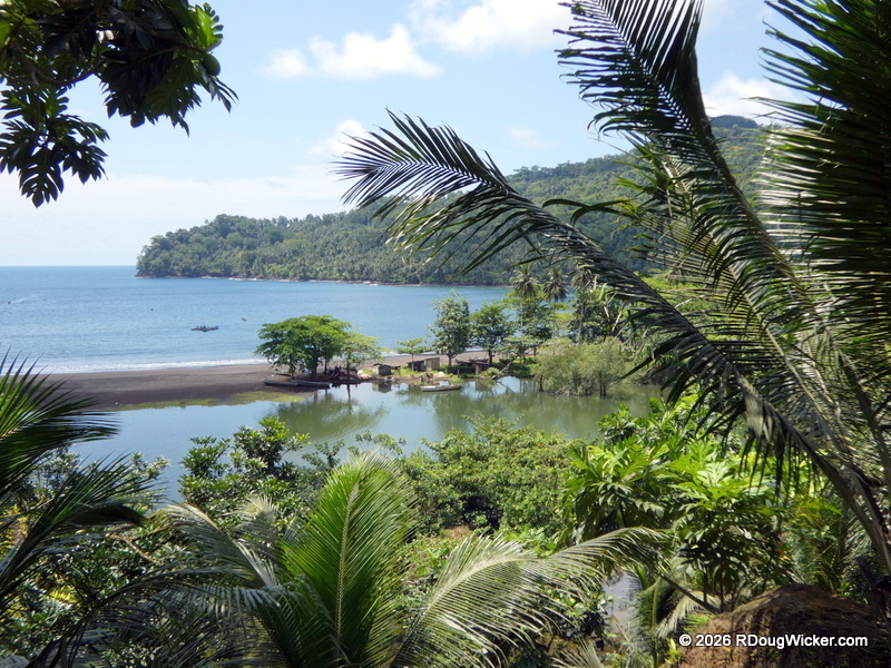 Okay, back on the bus and continuing south along the east coast of São Tomé to Cascata de Praia Pesqueira (Waterfall of Pesqueira Beach). A word of caution: the hike down to the waterfall is steep, slippery, and treacherous, especially for us older folk or, as with Ursula, someone who had recently received a new knee. We got off the bus in a small village with many rustic homes: