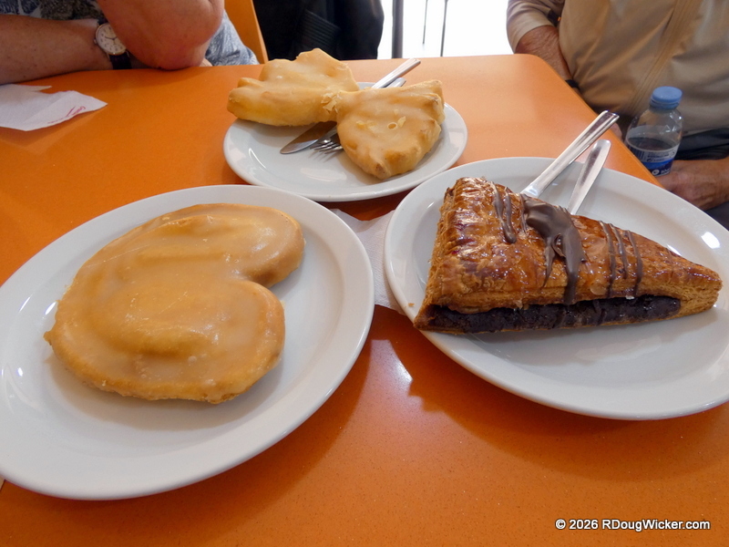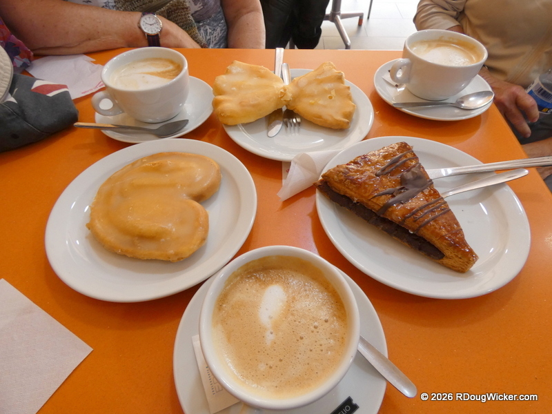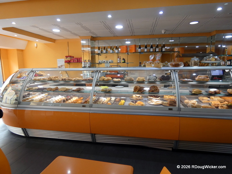 Time for a European-style pasty break, and Ursula found us a wonderful little stop. We were accompanied on this little excursion by my bridge partner aboard NCL Dawn, so we had a three-way share of delights. If you’re going to pin me down as to the particular pastry shop, I’ll tell you that I believe it was Café Palmelita (Google rating 4.2 out of 6,117 reviews). I’ll begin by showing you the display case of goodies that awaited us: