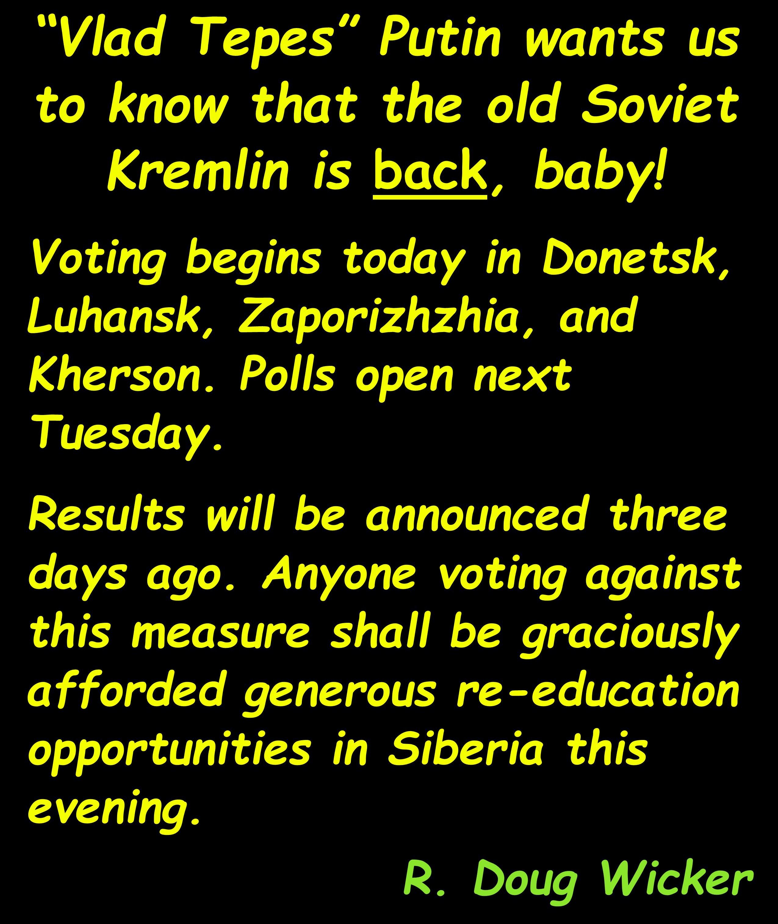 Today I’m going to tag this opinion piece as “humor” even though there is very little that is humorous about this situation other than how the blood lusting “Vlad Tepes” Putin keeps getting kicked squarely in his assets. This latest situation involving a rigged secession vote, the outcome of which was announced by Pravda three days ago (I kid you not), is deadly serious. Vlad “Tepes” is already threatening to throw a nuclear temper tantrum if other nations do not respect the predetermined outcome. Even enablers Xi Jinping, Narendra Modi, and Recep Erdoğan are starting to distance themselves from this fiasco (welcome to the club, I guess, since all three of you helped create today’s very dangerous situation).