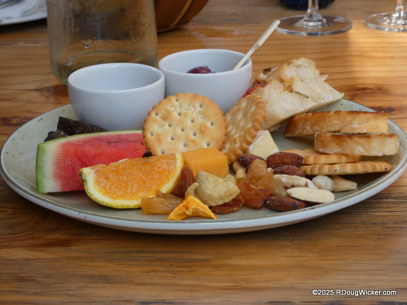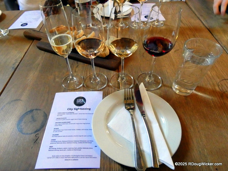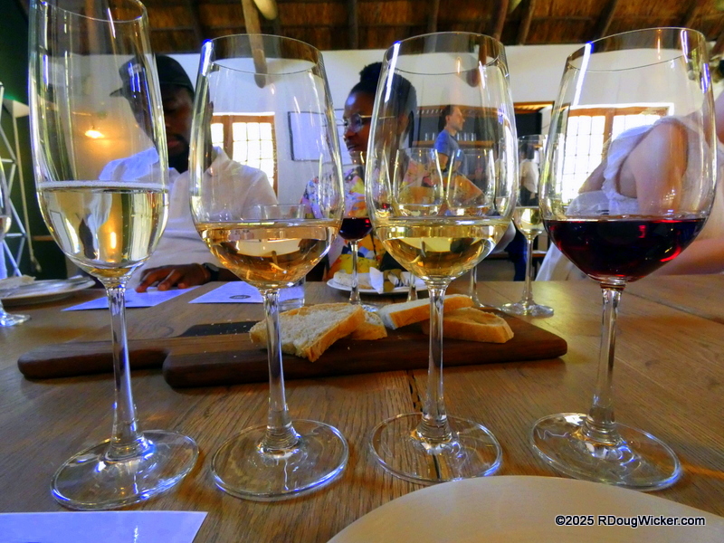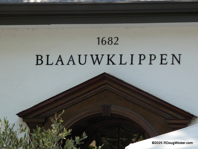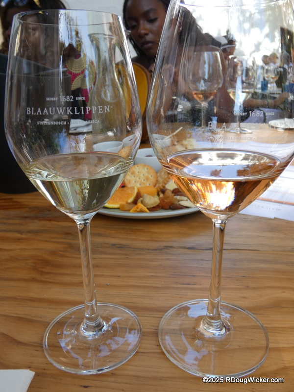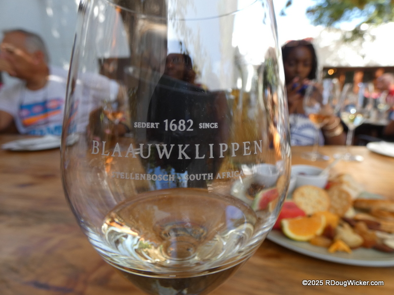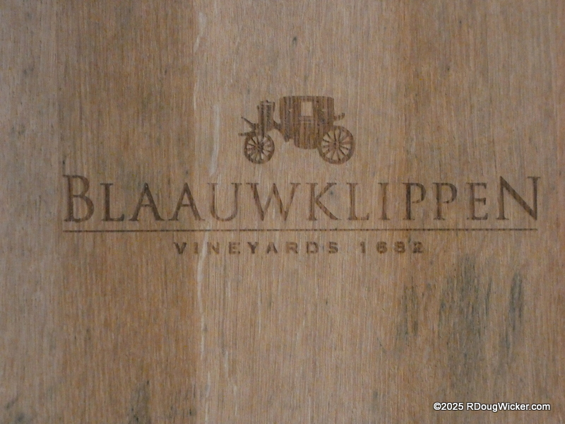 Monday of last week I told you that the wines at the Rhebokskloof Wine Estate were passable, but the house-made chocolates were superb. Last Wednesday I revealed that Vrede en Lust had, by far, the most consistently good selection of wines, as well as an incredible burger. Today, I’m sorry to report, we finish with the least favorite winery of the tour —Blaauwklippen Wine Estate. And that’s not just me talking. Ursula agreed, as did several of our table mates. If I were inclined to purchase any wines on this tour, this would not be the vintner I would choose. Even the presentation of the snacks left a lot to be desired: