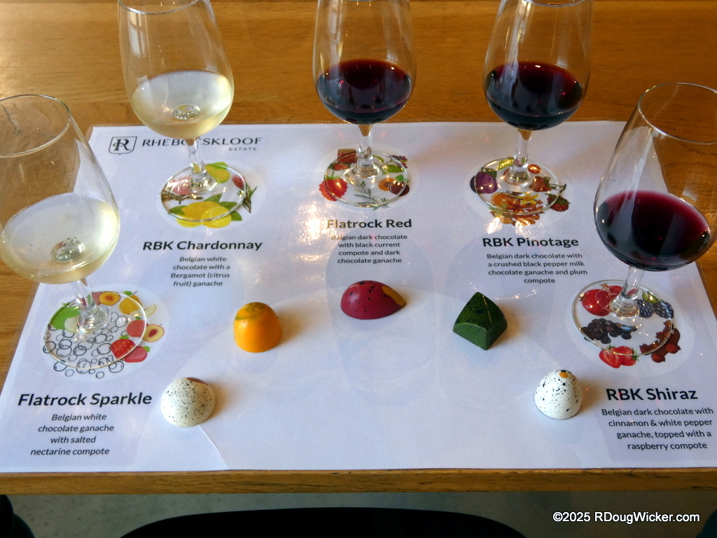 Of course, it wouldn’t be South Africa without that signature South African varietal Pinotage, which Rhebokskloof also cultivates. But they also drift into some of the more robust whites, such as Chenin Blanc and Chardonnay. But what you won’t guess is what they pair with their wines. Fine gourmet chocolates made in house: