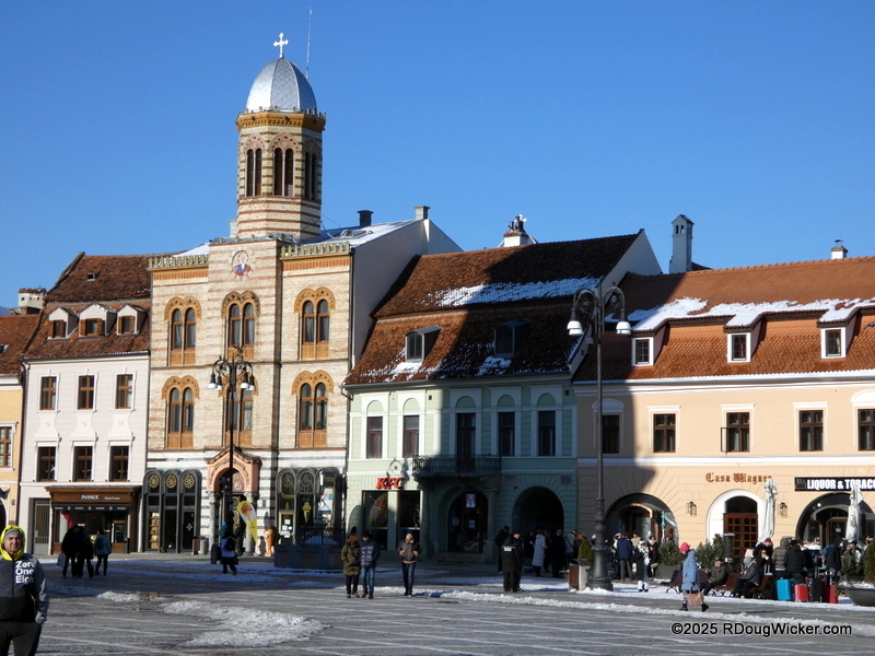 There are a lot of very interesting buildings surrounding Council Square. The silver domed structure below is Librăria Arhidiecezana Brașov (Archdiocesan Bookstore Brașov):