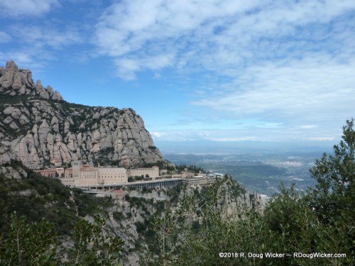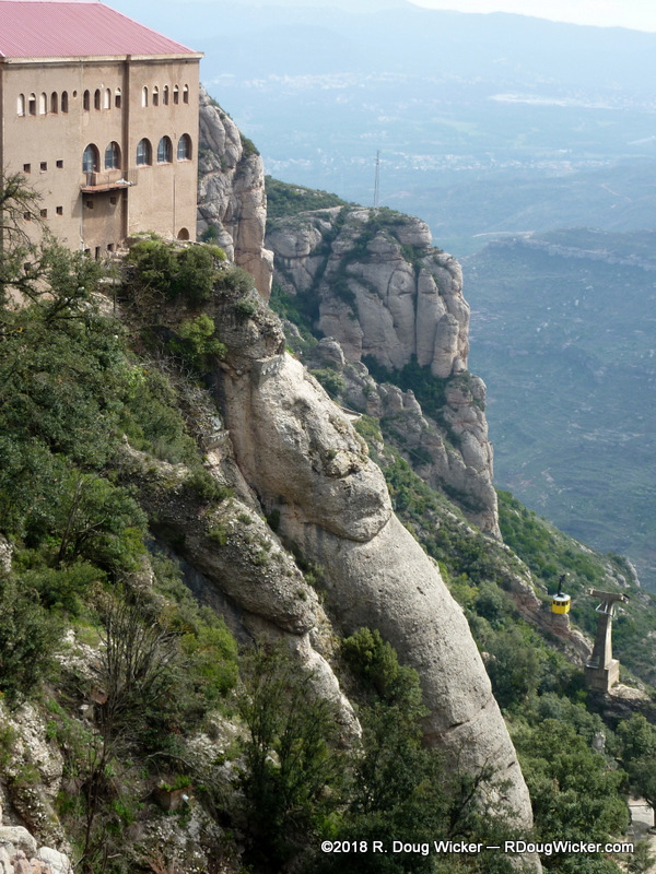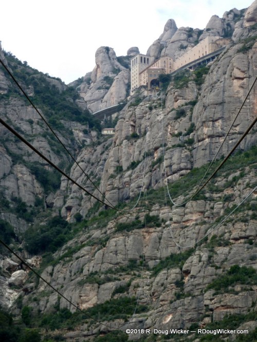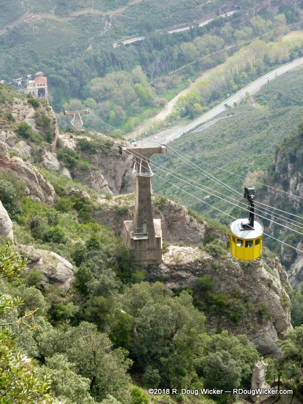 MS Prinsendam left the island of Ibiza on April 7 and docked the next morning in Barcelona. I’ve done many blogs on Barcelona, as Ursula and I have been there several times. This time we had a different destination in mind, so with two friends from Canada whom we met on this cruise, we took a train northwest out of the city and headed toward the Catalan Pre-Coastal Range and the small town of Monistrol de Montserrat. Here we disembarked from the train and climbed aboard the Aeri de Montserrat aerial tramway.