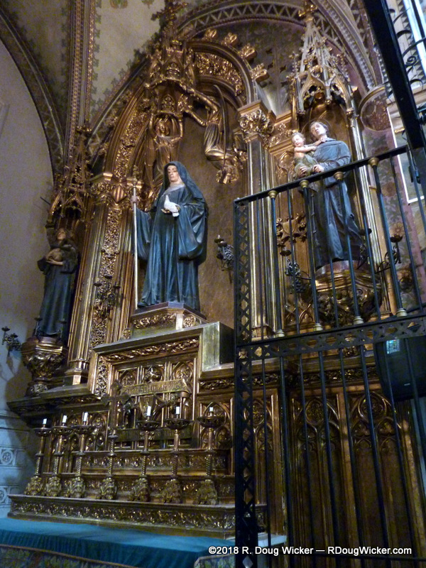 The Montserrat Basilica is also located here, and within the basilica is the famous Virgin of Montserrat, also known as the ‘Black Virgin’. The Black Virgin is in the lighted alcove above the altar in the photograph below.
