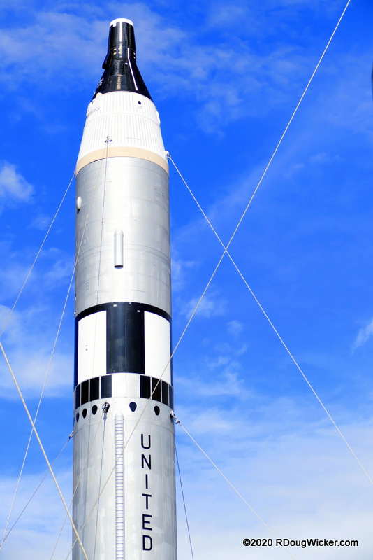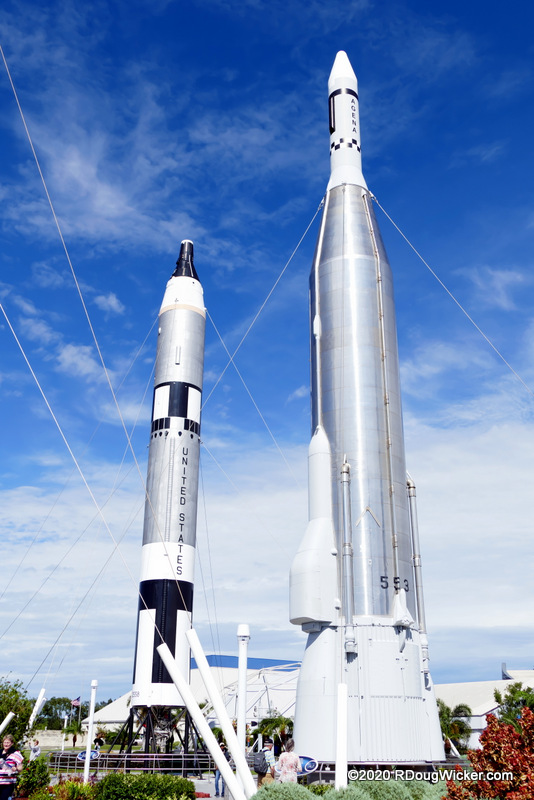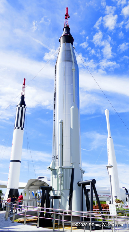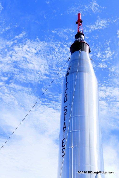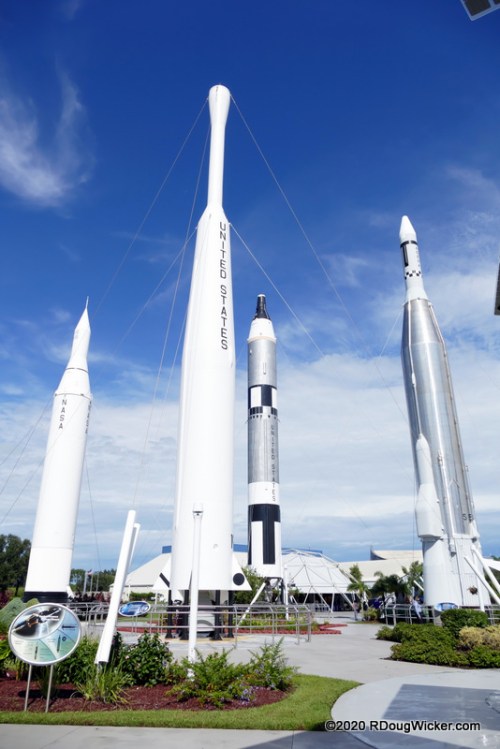 Now that the clouds have finally broken and the sun is out, let’s go explore the Rocket Garden. We’ll begin with an image of a Mercury Redstone manned suborbital launch vehicle, Mercury Atlas manned orbital vehicle, and a Delta rocket.