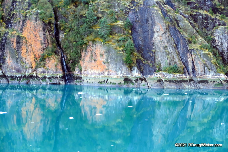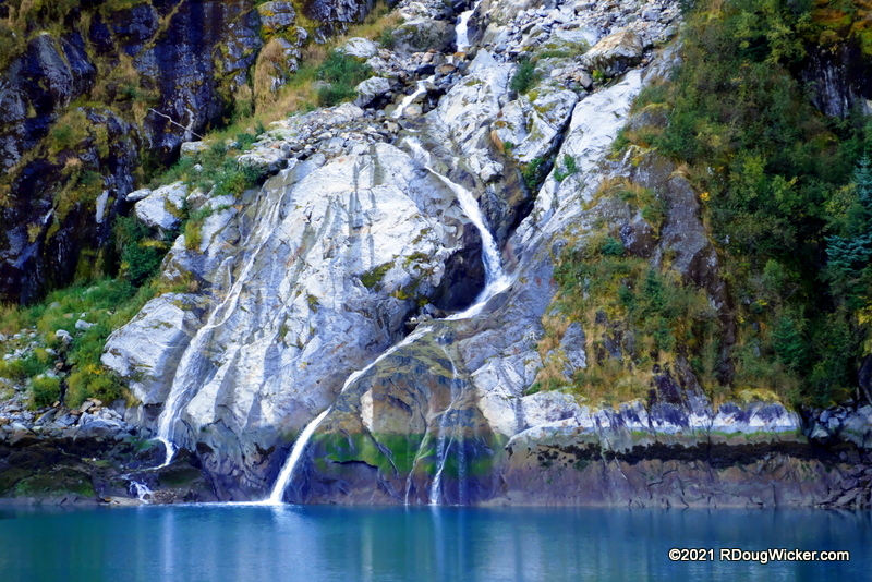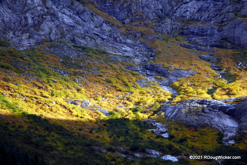 The walls of Endicott Arm are steep. Very steep. And myriad waterfalls cascade down their sheer dropoffs into the cold, glacier-fed waters below. The pictures shown today were taken on Cruise 2 of our back-to-back off-season Alaska voyages. So, the photos you see today were taken on 6 October in bright sunlit conditions.
