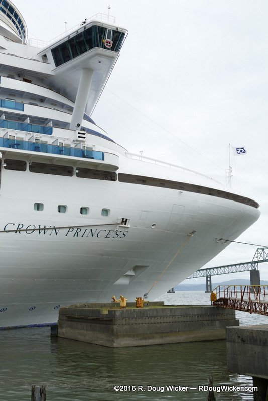 The Astoria Riverwalk runs along the water parallel to Marine Drive, which also goes by the name East Columbia River Highway/U.S. Route 30. Stay on the Riverwalk to get the best shots. Here’s a view looking back toward Cannery Pier, with the Crown Princess docked behind:
