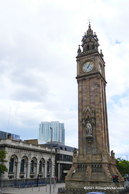 Just northeast of Montague Burton is the Albert Memorial Clock at Queen’s Square and Victoria Street which you can see in the distance as we head toward it on High Street:
