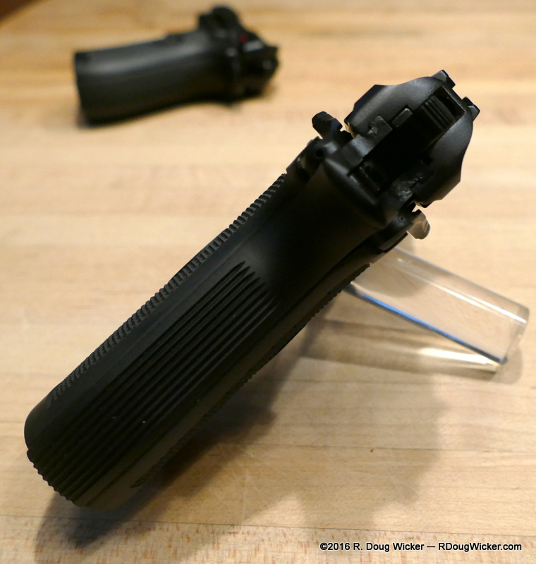 Cosmetically, the differences between the 84BB and 84F were huge. The finish went from high-gloss blue to Beretta’s more durable, semi-matte Bruniton finish (and, yes, I’ve seen a factory nickel version of the FS as well). Gone were the wood grips with medallions; they were replaced with hard plastic grips. The elegantly rounded trigger guard gave way to a squared-off combat-style with some front serrations. The slide was also notched at the safety, and the slide indentation for the catch was now hidden from view. You can see some of these changes in the image below from my previous 2016 article on the 84FS and 85FS Cheetahs:
