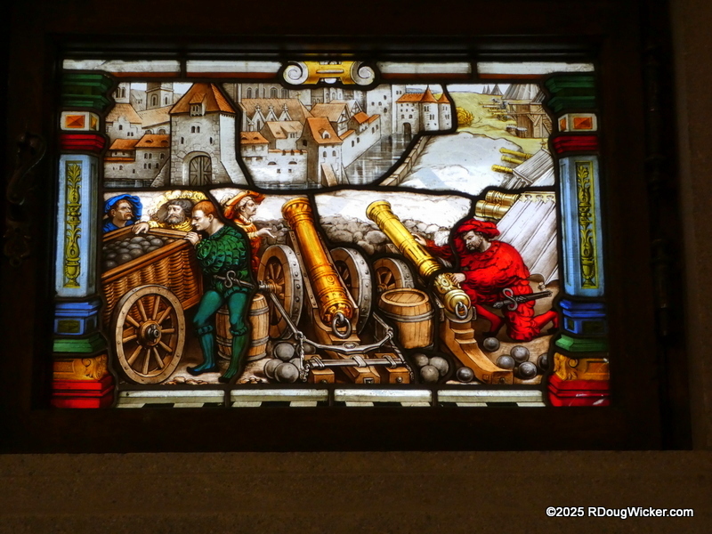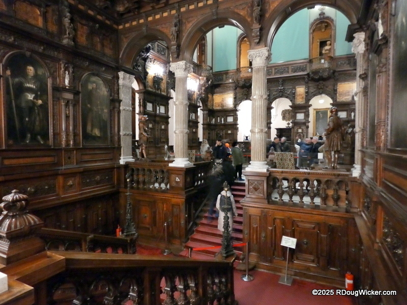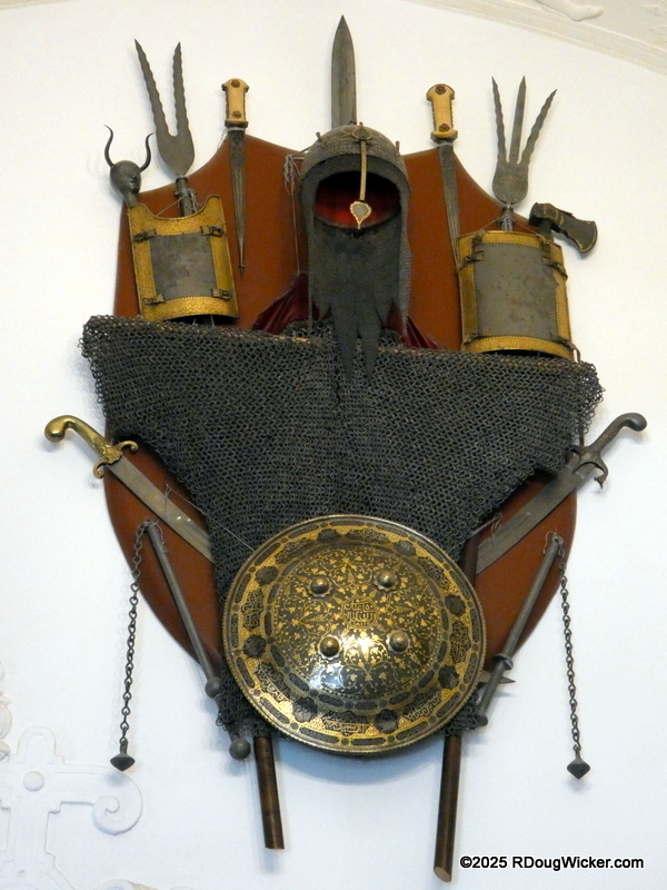 As one would expect in a royal palace, Peleș Castle is filled with fine art, including some magnificent examples of stained glass. Other works within the walls of Peleș Castle are finely decortated ceilings, statuary, and medieval implements of knightly arms and armor used is decorative wall hangings.