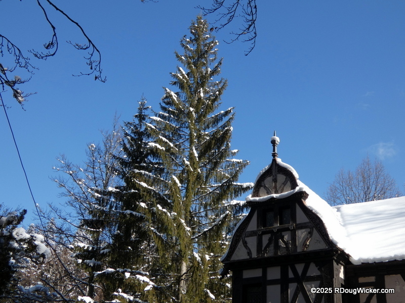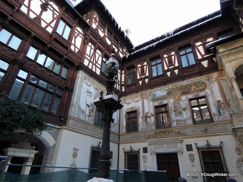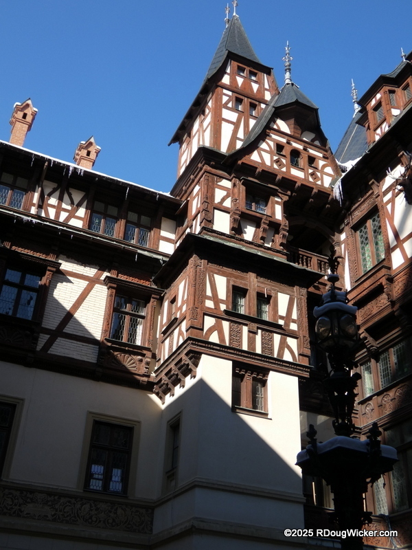About 70 miles/115 kilometers (87 miles/140 kilometers by tour bus) north of Bucharest, 20 miles/30 kilometers south of Brasov, high in the Southern Carpathian Mountains, lies a grand 34,000 square foot/3,200m² palace containing over 170 rooms. This is Peleș Castle, begun in 1873, opened in 1883, and improvements continued into 1914. As you might expect, 170 rooms and the surrounding grounds is a lot to cover, so we’ll be looking at this magnificent palace both this week and next. Exiting the bus we still had a walk to complete before we arrived at the castle, but the small collection of buildings catering to tourists had a charm all their own: