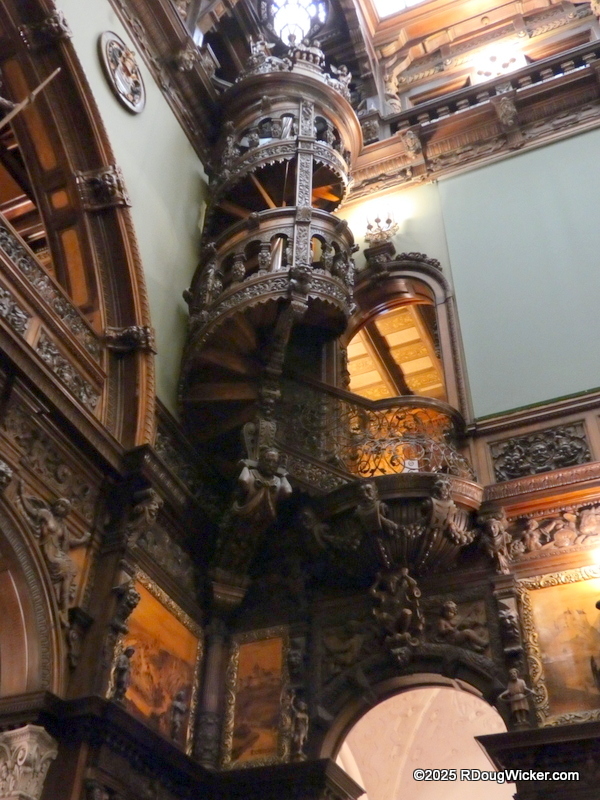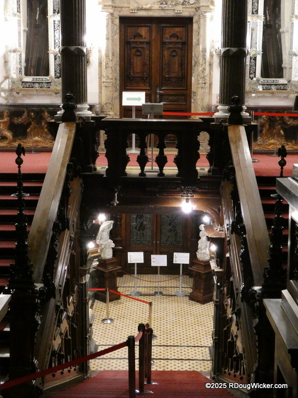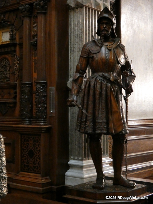 Peleș Castle has an extensive collection of medieval arms and armor, including armor for a horse. However, before you step into this armaments room, you’ll pass by some interesting wooden carvings, impressively tall ceilings, a magnificent carved wood spiral staircase, and other sights. But you don’t need to listen to me drone on about all that. You want pictures, and pictures you shall have: