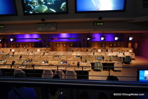 In this mock-up, which is in the Race to the Moon: Apollo/Saturn V Center, overhead monitors play recorded scenes from the launch of Apollo 8 — the first manned spacecraft to leave low Earth orbit and head toward the Moon.