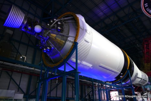 But the star of this show is overhead. That’s the various components of the enormous Saturn V rocket that sent a dozen men to the moon over the course of six missions: