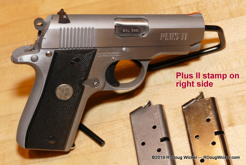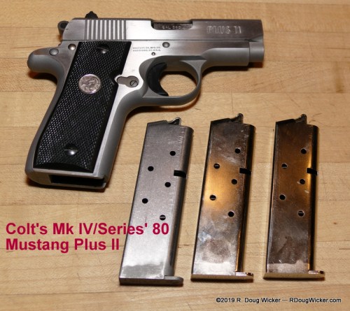 That pistol is the Colt MK IV/Series 80 Mustang Plus II. The Mustang Plus II took the all steel 7+1 capacity frame of the Government Model 380, and mated to it the shorter slide and barrel from the 5+1 (later increased to 6+1 after 1992) capacity Mustang — two additional rounds, hence the name Mustang Plus II. These original Mustang Plus II pistols were blued steel, but sometime around 1990 Colt came out with a stainless version. Production of the stainless Mustang Plus II was thus only around seven or eight years, making this a bit of a rarity. At least I’d never seen one, up until July of last year.