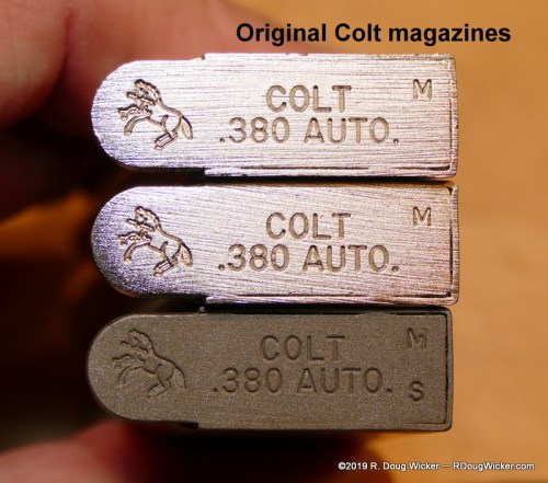 The MK IV/Series 80 Mustang Plus II you see here today was manufactured in 1991, and appears very lightly used with no holster wear marring the stainless slide. It came with three factory magazines, which on the base are stamped with the Rampant Colt trademark, the letter ‘M’ on all three magazines, and the letter ‘S’ also on the nickel plated magazine, and the words ‘Colt .380 Auto.’ on all three.