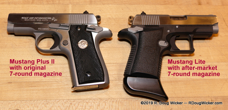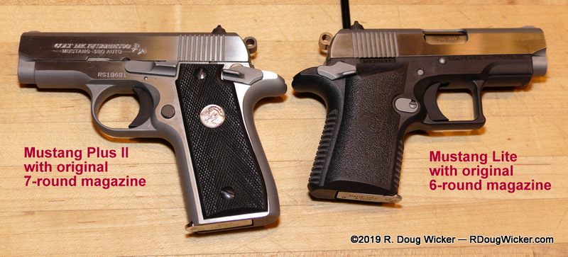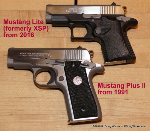 But it’s the weight that most distinguishes the two. The Mustang Lite with it’s lightweight polymer frame, is a mere 12.54 ounces/356 grams including a empty magazine 11.2 ounces/318 grams without magazine). The slightly larger, all steel Mustang Plus II tips my scale at 19.42 ounces/551 grams (17.9 ounces/508 grams without magazine).