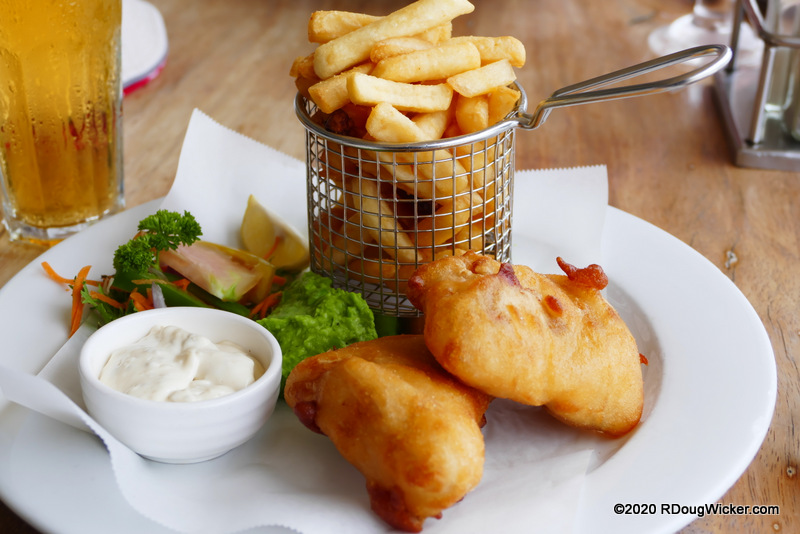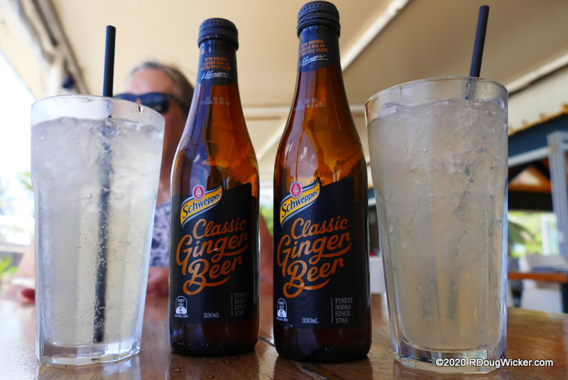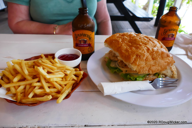 What you get when retrieve your order is an enormous amount of wonderfully fresh fries and a huge sandwich with a delightfully crisp fillet of fresh island fish. We included with our shared dinner a couple of Bundaberg ginger beers, which we fell in love with during a prior trip to Australia: