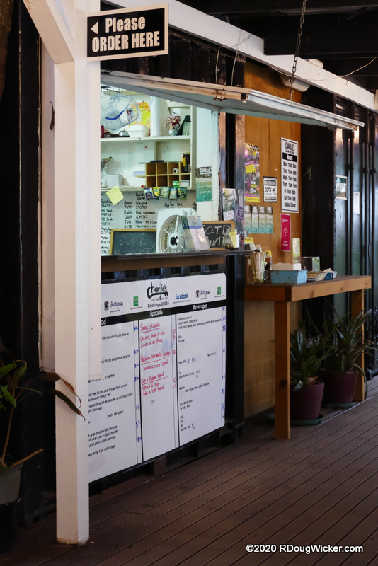 Today is a twofer — two Rarotonga, Cook Islands restaurant reviews. The first one on today’s menu (see what I did there?) is Charlie’s in the Takitumu District on the south side of Rarotonga. Charlie’s was easy to get to from our rental in the adjoining Muri District, about a fifteen-minute walk. Ursula read about this place before we arrived, and she told me that Charlie’s is famous for their fish sandwich. So, after seeing one walked by, we opted to split a sandwich and order of fries. A good thing, because it was massive! But first you have to go to the ordering window to place place your order: