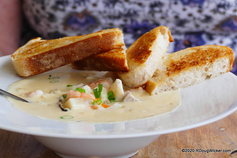 Ursula’s seafood chowder was a better choice. She loved it, and I concur with her assessment. It was creamy, and chock-full of seafood and root vegetables. Accompanying this tasty chowder was a generous serving of buttered garlic toast.