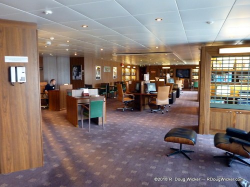 MS Prinsendam to being the smallest ship, she’s also the oldest ship in Holland America’s fleet, and probably one of the oldest ships of any major cruise line. That doesn’t detract from either her charm or her ability for passengers to find something to do. Here, again, is the Explorations Café library and internet area: