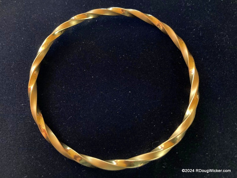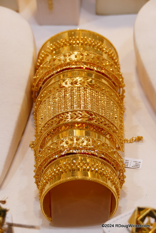 Gold sold here comes in basically four flavors — 24K, 22K, 21K, and 18K. Gold for bracelets, rings, and other pieces subject to dings, squishing, and other abuse generally come in the 18-to-21K range. Here’s a 21K bangle that I finally managed to talk Ursula into letting me acquire for her after I insisted we return (twice) to the store selling it: