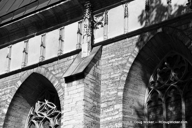 But not all textured, monochromatic images benefit from such treatment. Occasionally you’ll stumble across the exception, in which just a hint of color makes the image pop. Below is an example of what I mean, where just a hint of exposed red brick and a rusty discoloration beneath the wooden doors serve to contrast an otherwise monochromatic composition.